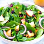 This simple Spinach Salad is crunchy, earthy deliciousness year-round, but if feels especially suited to fall with apples, cranberries and walnuts. The apple cider vinaigrette makes the salad sing with sweet tart flavor and is our go-to everyday dressing. Spinach Salad is so easy and the perfect complement to any main dish.